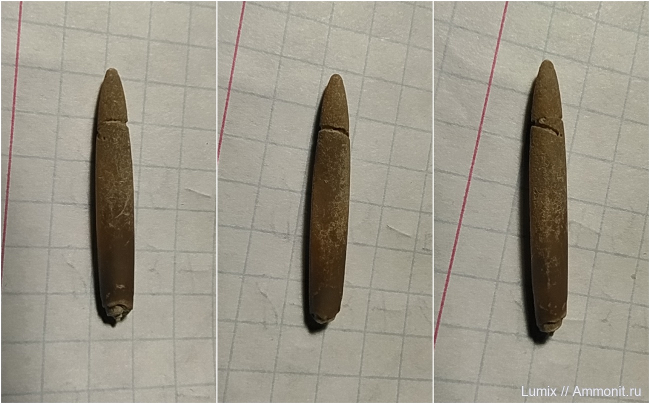 Ростр у белемнита был твердым, так что никакие когти или "удавки" не могли оставить такого следа. Это ход какого-то червя-камнеточца, сверлившего ростр. В раковинах двустворок и брахиопод часто встречаются такие же ходы. | ||||||