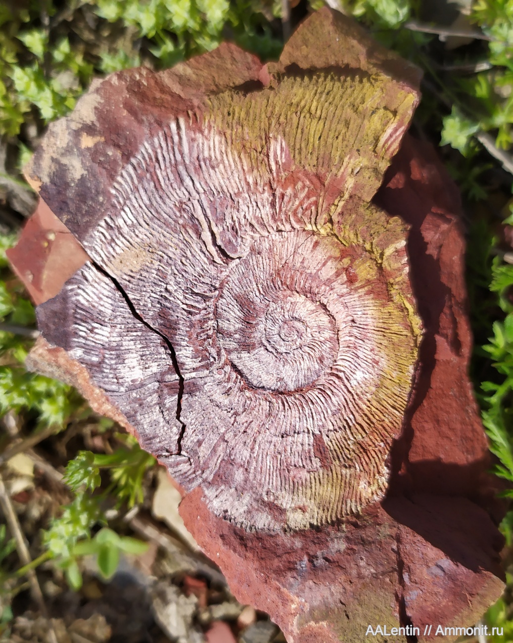 Данный отпечаток Zaraiskites densecostatus открыл мой сын Никита. Аммонит размером 10 на 7 см.