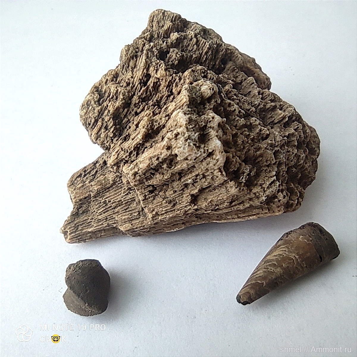 Губка - 6х3 см, брахиопода - 1х1 см, фрагмокон - 2 см.
