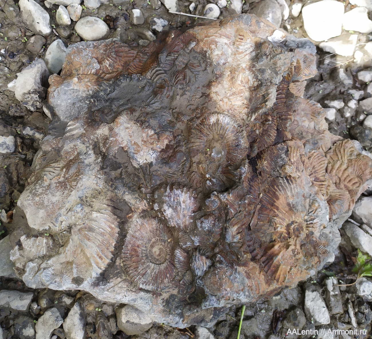 При обследовании поймы речки Протомойка у п.Городищи была найдена плита, с торца которой виднелись ребра аммонитов. При раскалывании плита разделалась на две части. На верхней части были отпечатки от аммонитов, а на нижней были сами аммониты (представлена на фото). Размер плиты 29х32 см. Фото сделано на месте событий. Что за аммониты представлены на плите, я определить затрудняюсь, так как таких нахожу впервые. Возможно это Deshayesites? Прошу помочь с определением.