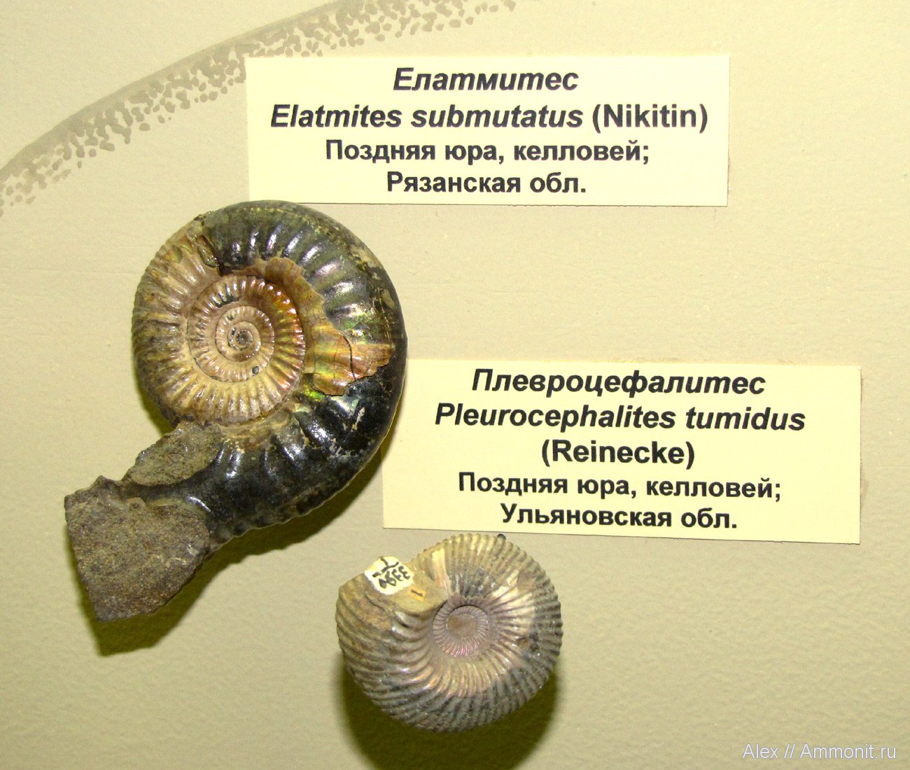 Аммониты Elatmites submutatus (скорее всего из Елатьмы) и Pleurocephalites tumidus. Правда этот "плевроцефалитес" на самом деле Cadoceras ex gr. elatmae, скорее всего тоже из Елатьмы или Нижегородской области.