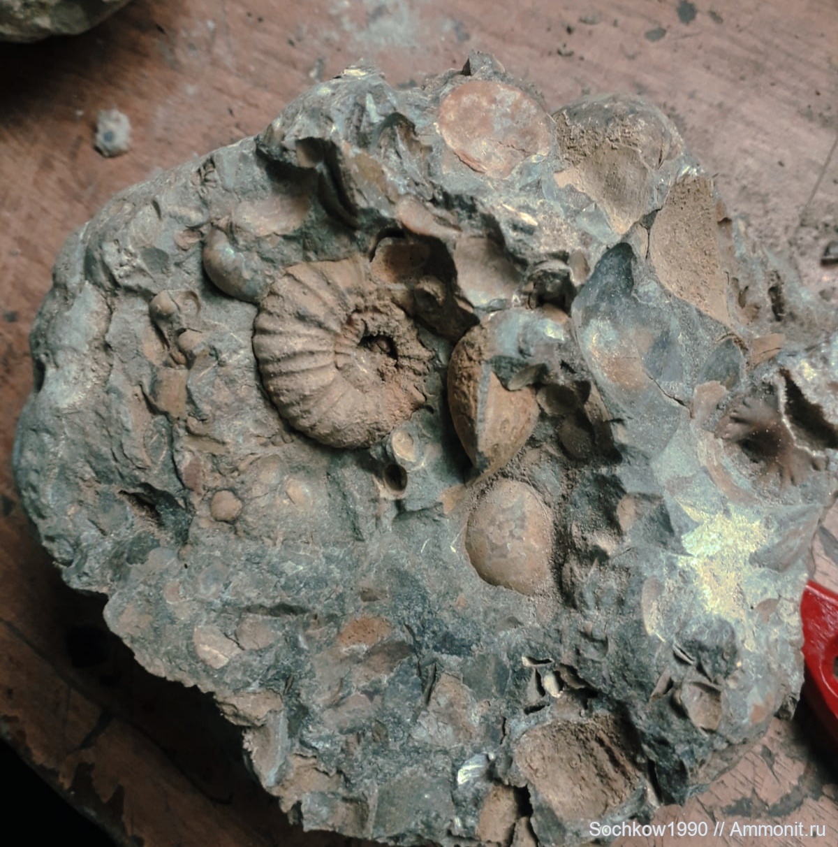 Наш первый выезд на реку Губс 09.07.22 задались задачей отыскать аммонитов. В итоге за целый день поисков ничего не нашли . Перед самым отъездом в сторону дома друг прихватил ничем неприметную глыбу с полной уверенностью, что в ней что-то будет. На месте вскрывать не стал, поработал над ней уже дома. Итог на фото.так же буду признателен за помощь в определении возраста и видовой принадлежности!
