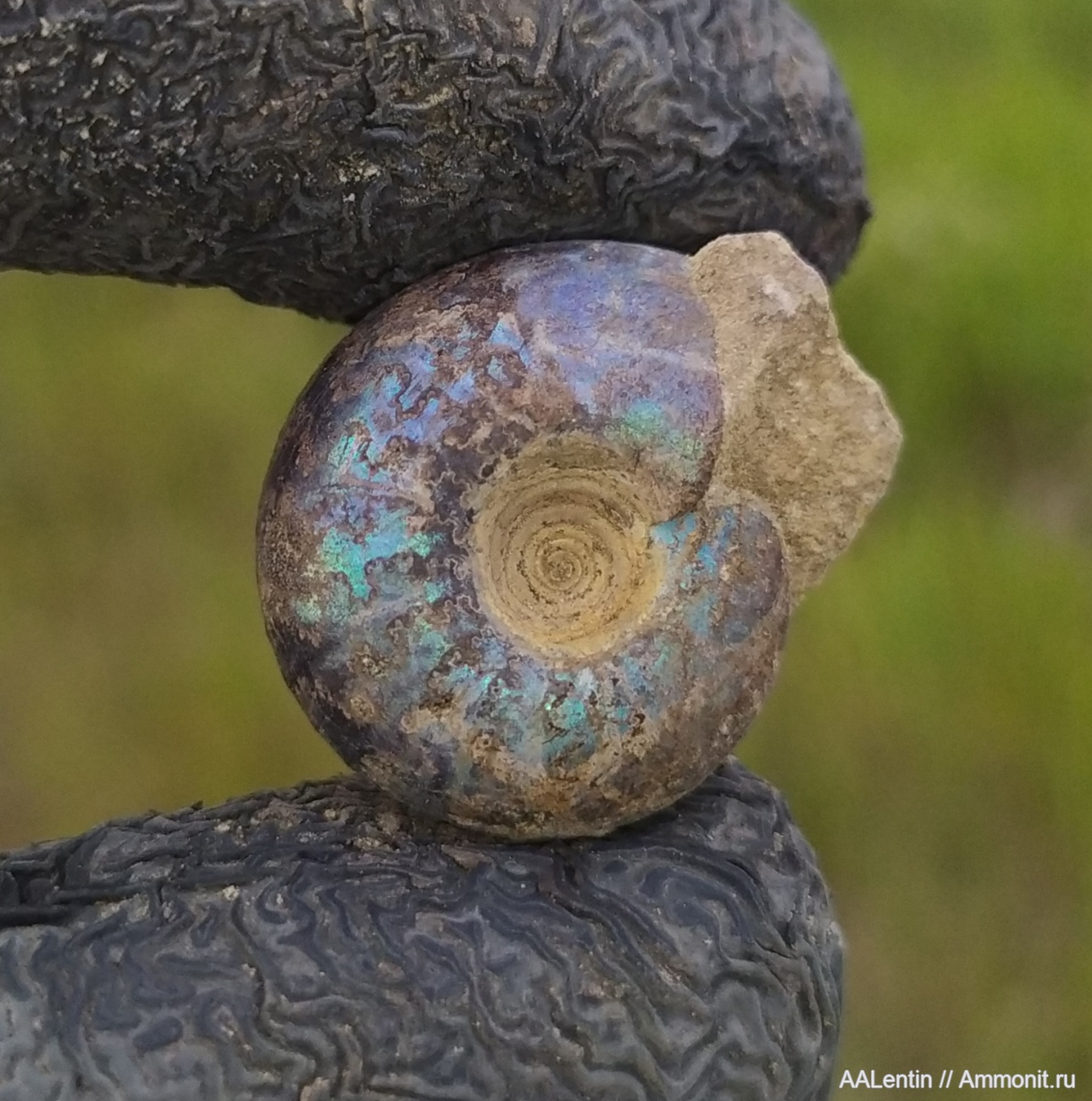 Крайне редкая для меня находка: целый аммонит Craspedites с целым пупком, частично сохранившимся перламутром. Размер 2х1,8 см. Фото с места находки. Вот сфотографировал пупок аммонита поближе: