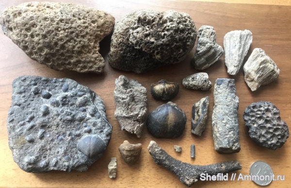 Кораллы, губки, ругозы, брахиоподы, членики морской лилии и иглы ежей, песчаные и халцедоновые конкреции - ходы (корней? или донных животных?)