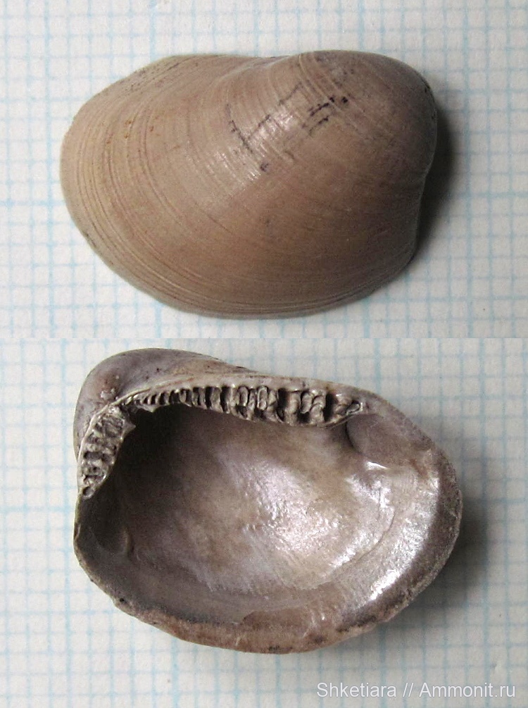 Несколько необычная для Тимонино створка. Из отвалов, как и все нынешние находки на этом объекте, но скорее всего оксфорд. На снимке вроде бы видны тоненькие концентрические складки, но на ощупь внешняя поверхность кажется гладкой. В грубом приближении похожа на Nuсuloma sp., хотя это без всякой уверенности, так, полет мыслей дилетанта.