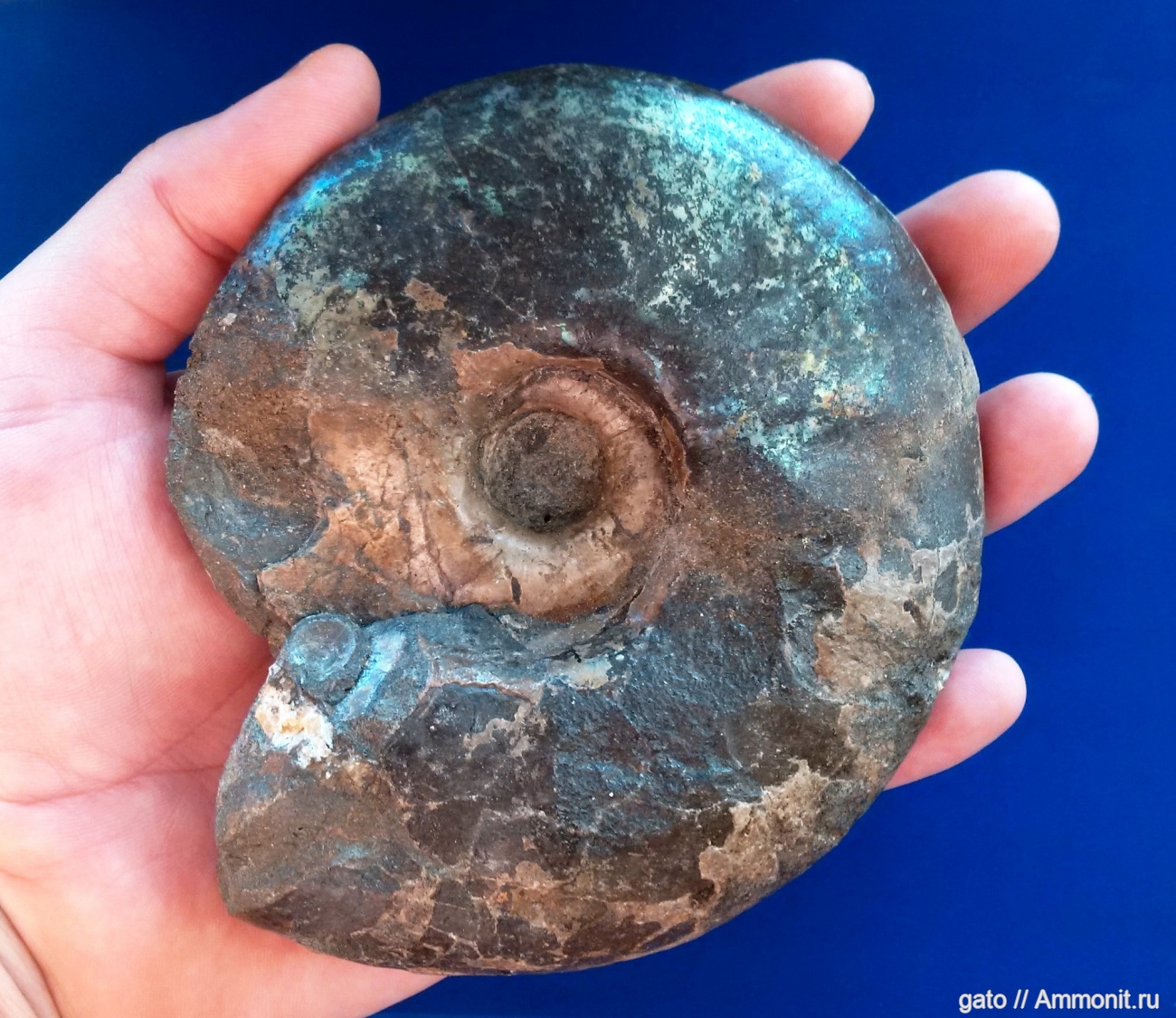 Такие аммониты встречаются в разбросанных по берегу глыбах к югу от Городищ. Cнаружи - вполне ничего с налетом цветного перламутра, а с другой стороны - серые, тонкие и деформированные, будто сохранилась только "крышка кастрюли". Соответственно, их трудно как выбить из породы, так и найти целыми. Диаметр 13 см, песчаник