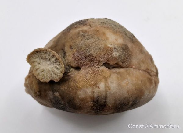 Впервые попался ордовикский коралл. И, как часто бывает, совершенно случайно. Первоначально был полностью скрыт породой. Крупным планом Фото, Фото. Коралл опирается сразу на обе створки. Если не ошибаюсь, горизонт Ухаку.