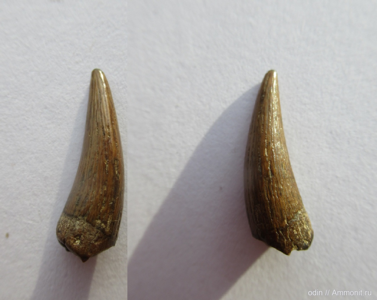 зуб эласмозавра,в сечении он отличается от прочих ,так как более приближен к овалу,наподобие плезиозавровых .Длина 18.5мм