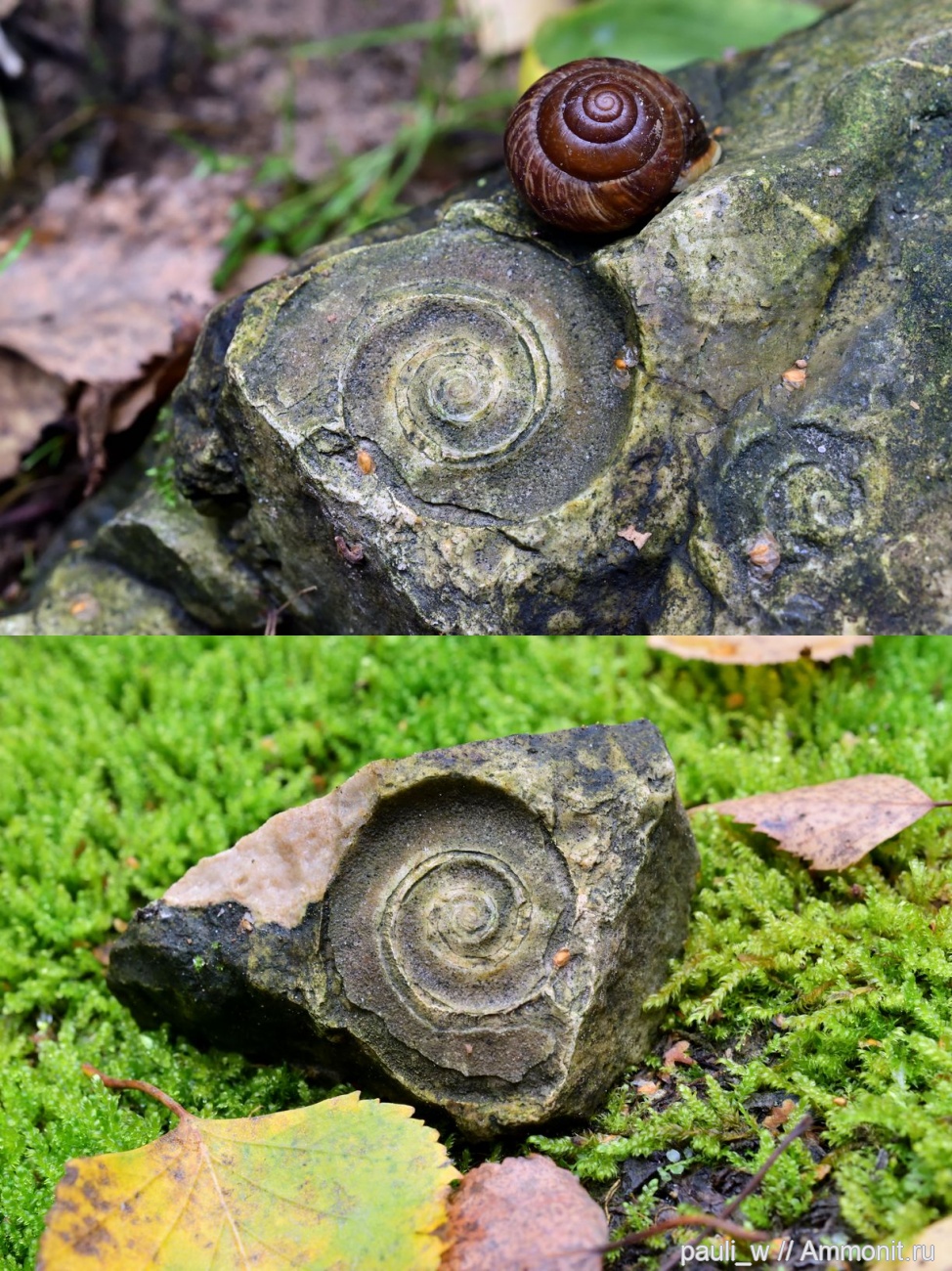 Отпечатки относительно крупных гастропод карбона на ледниковом валуне в сравнении с современной древесной улиткой (Arianta arbustorum). Тропаревский парк, октябрь 2022.