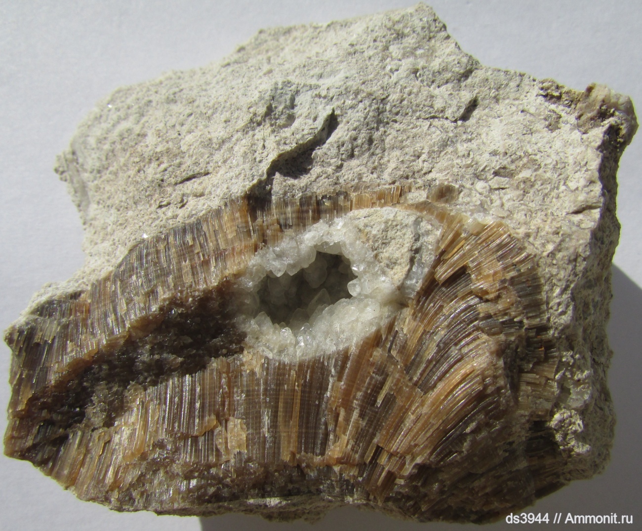 Данный образец, размерами 6,5*6 см., вызвал бурное обсуждение в моей группе в ВК, поэтому решил прислушаться к рекомендациям и выложить сюда. Образец найден на р. Фарс в верхнеюрских отложениях, так же подобные образцы известны из ср. течения р. Аминовка, Адыгея. На обратной приполированной стороне заметно, что фораминифера, как во вмещающей породе, включена в левую часть "губки" Фото обратной стороны В отличие от образцов, публиковавшихся ранее, например из Крыма, этот имеет большую толщину(3,1 см.) и крупное включение на сколе размером 2,1 см. с жеодой кристаллов кальцита.