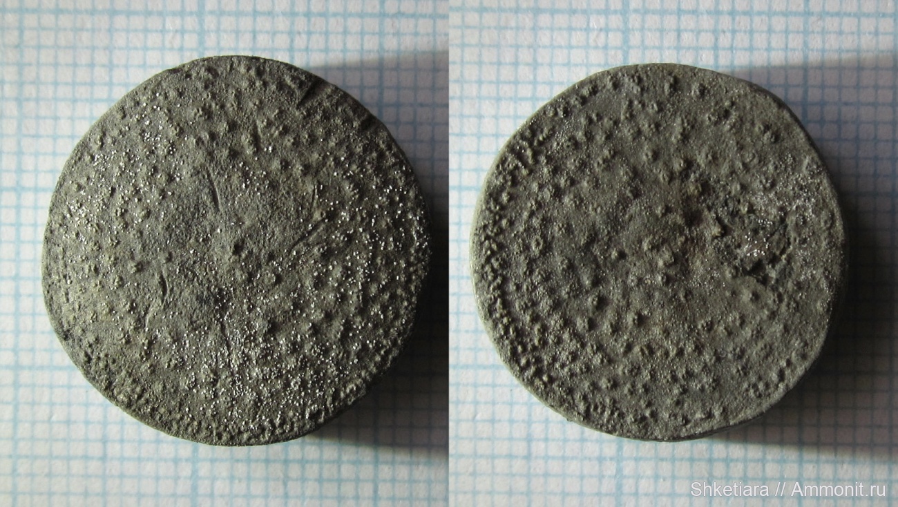 Диаметр этого образца около 19,5 мм, высота около 7,5 мм. Но при повторных замерах результат отличается на несколько десятых, поскольку форма заметно не цилиндрическая. Одна из фасеток (слева) слегка выпуклая, другая (справа) - слегка вогнутая. Боковая поверхность немного бочковидная. На левом снимке заметен осевой канал, он тонкий и вроде бы с намеком на звездообразность. На правом снимке канал не прослеживается. Оказывается, он вполне может быть виден с одной стороны членика и не виден с другой.