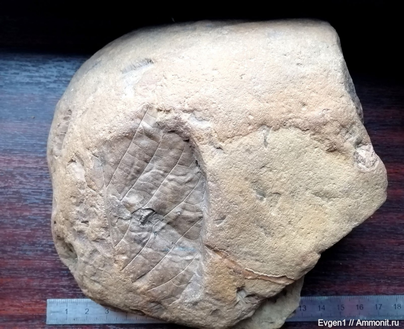 Отпечаток листа на породе с веточкой хвощевидного посредине, сборы 2022г, п.Ильинский, Сахалин