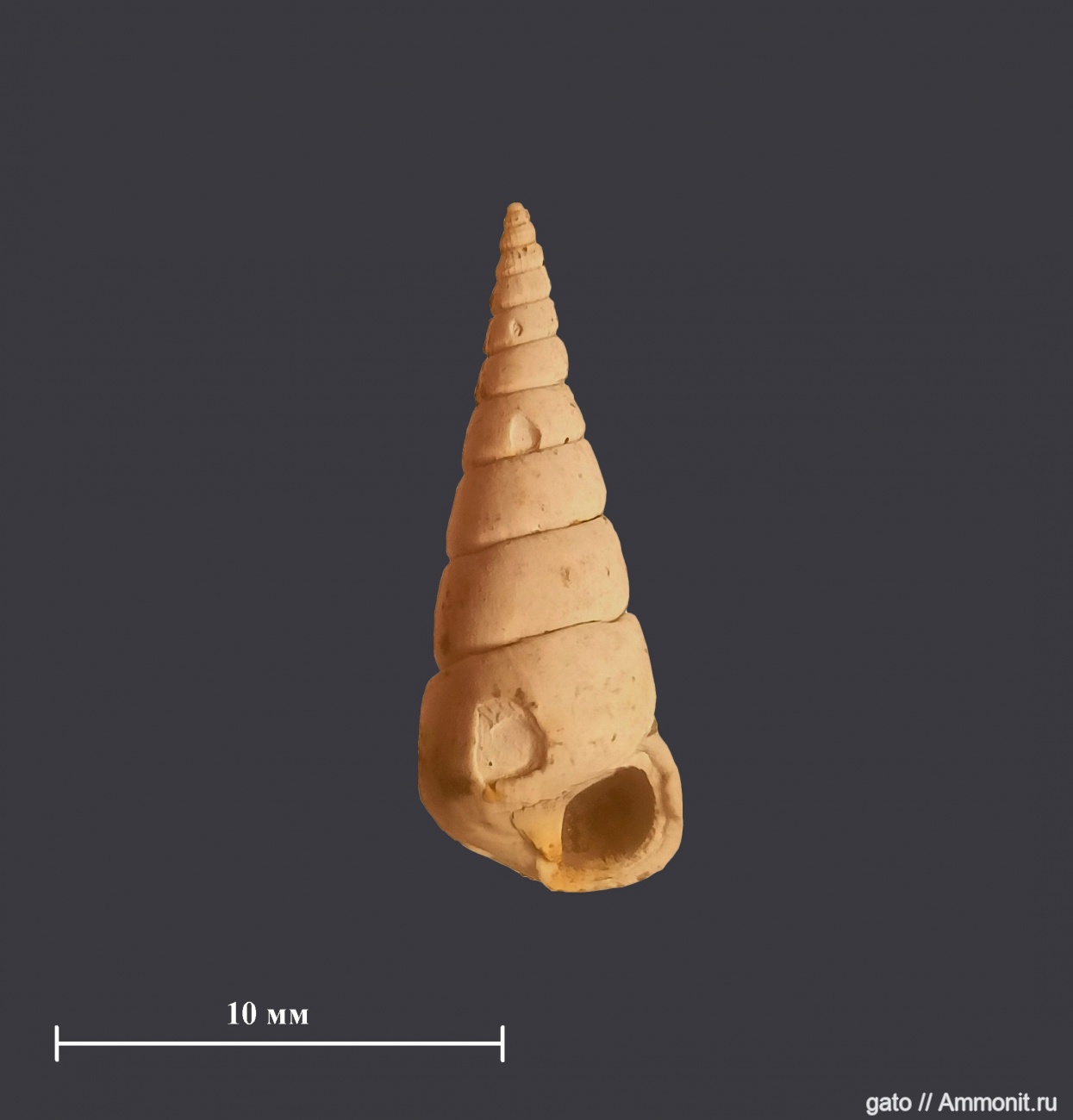 На первый взгляд простоватая, но довольно редкая гастропода, попалась лишь пару раз. У нее есть пара тузов в рукаве: например, заметно, что начало взрослой раковины ребристое, а затем скульптура сглаживается (явное эволюционное изменение, только к чему? По этой черте предположительно отнесена Gatto (2009) к Anoptychiidae. Другой вариант Gordenellidae, оба сестринские семейства матильдид).