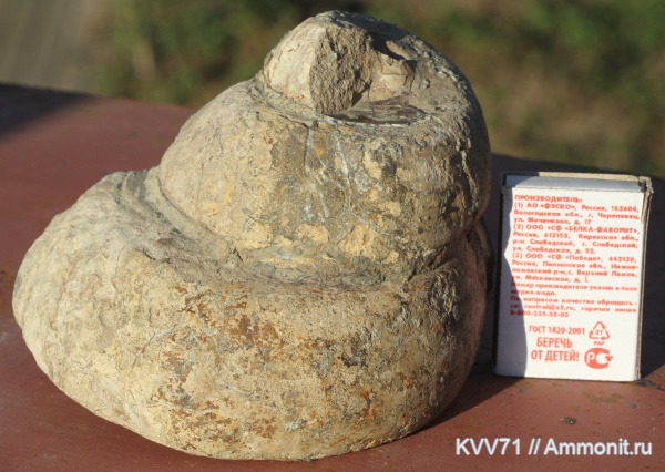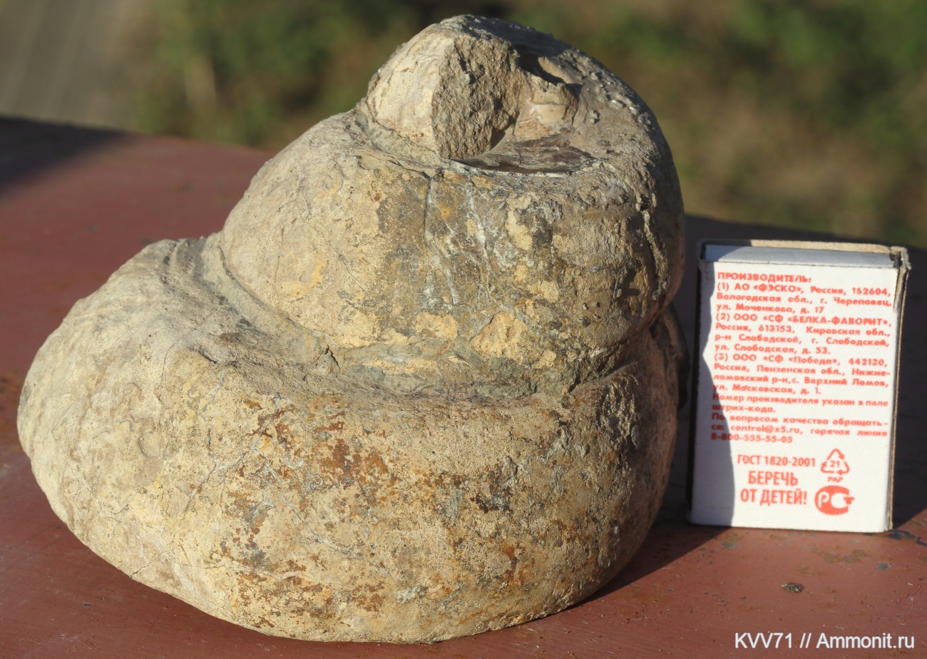 Даже не сама раковина, а ее ядро, без верхушки и устья. Находилась раковина в конкреции, вскрылась та самостоятельно под действием атмосферных воздействий, сколол только кусок породы со стороны устья. Интересно, что бентосная фауна на тех разрезах практически не встречается. Конечно не считал, но на 50-100 аммонитов встречается один брюхоногий, двустворка. Связано это видимо с быстрым осадконакоплением (авандельта реки) и большой глубиной океана.