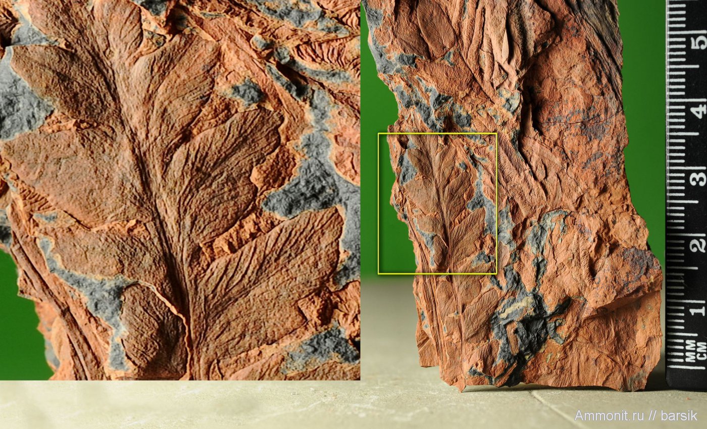 На самом деле здесь смесь различных листьев, в верхней части нейроптерис, в рамке, на мой взгляд, Mariopteris muricata.Можно сравнить