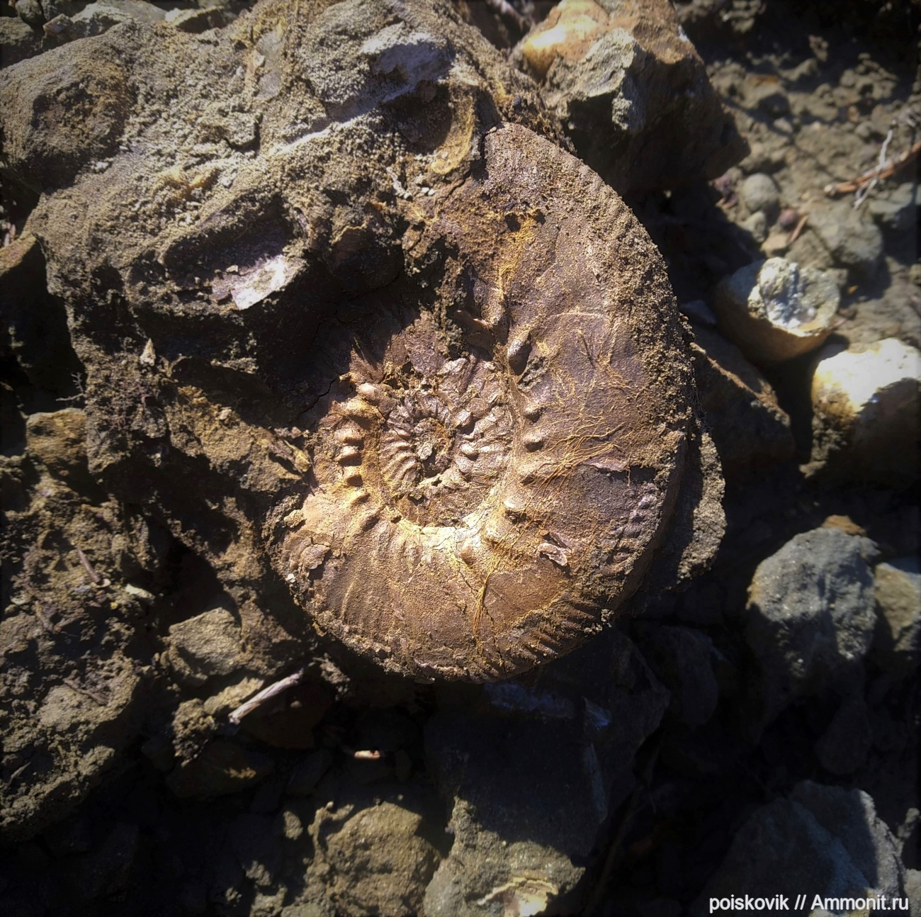 Аммонит (диаметр - 12 см) на месте находки. Берриасские отложения в окрестностях п. Куйбышево.