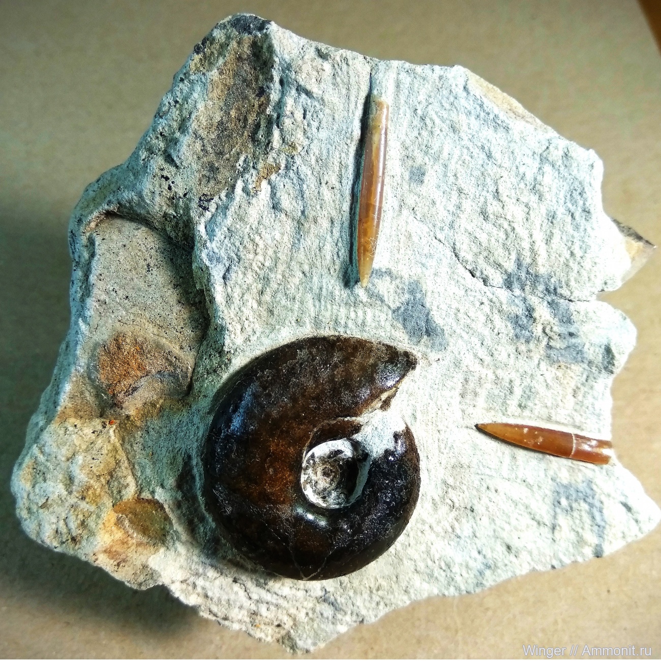 Некрупный аммонит Craspedites sp. из Кашпира. Размер аммонита 37мм, размер плитки 90х100мм. В ассоциации с парочкой ростров белемнитов. Белемниты, матрица и расположение окаменелостей на ней оригинальные, без подклеивания и изменения расположения их в композиции, все как отпрепарированно, так и есть.