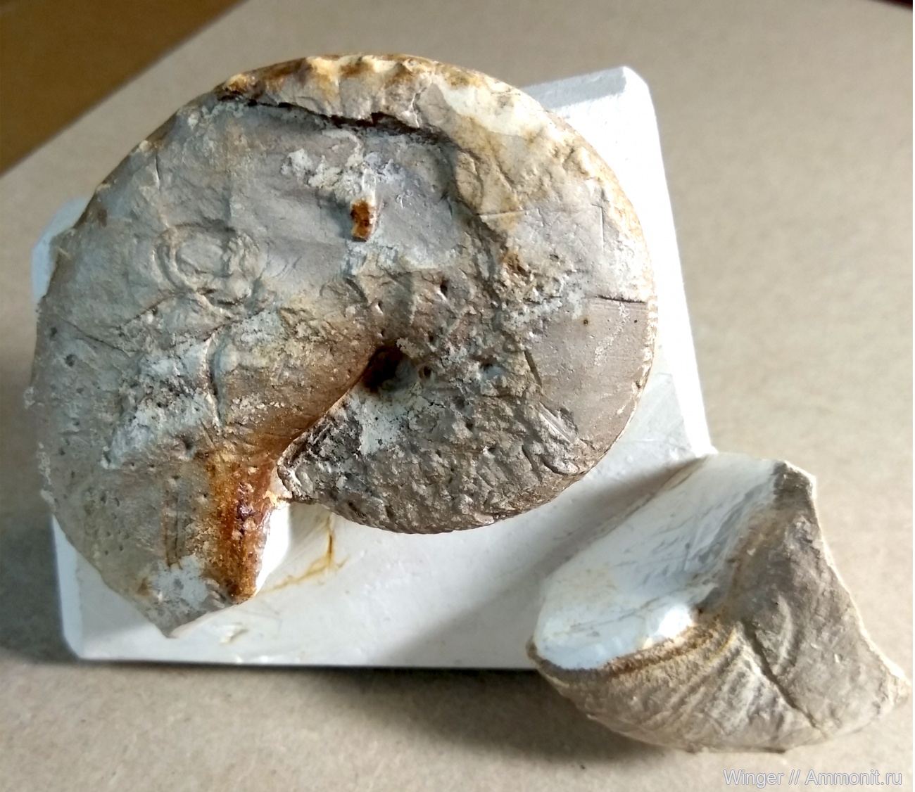 На фото представлен один из найденных недавно и препарированных мною аммонитов. По сути пробный вариант с обкатыванием технологии. Устье аммонита сохранить не удалось, но в тот же день и в том же месте было найдено устье другого аммонита того же рода, целое и красивое, но вот аммонит которому оно принадлежало найти не смог. В итоге было решено добавить в композицию устье подсадив его к аммониту на оригинальной матрице, получилось возможно наивно, но вполне информативно.