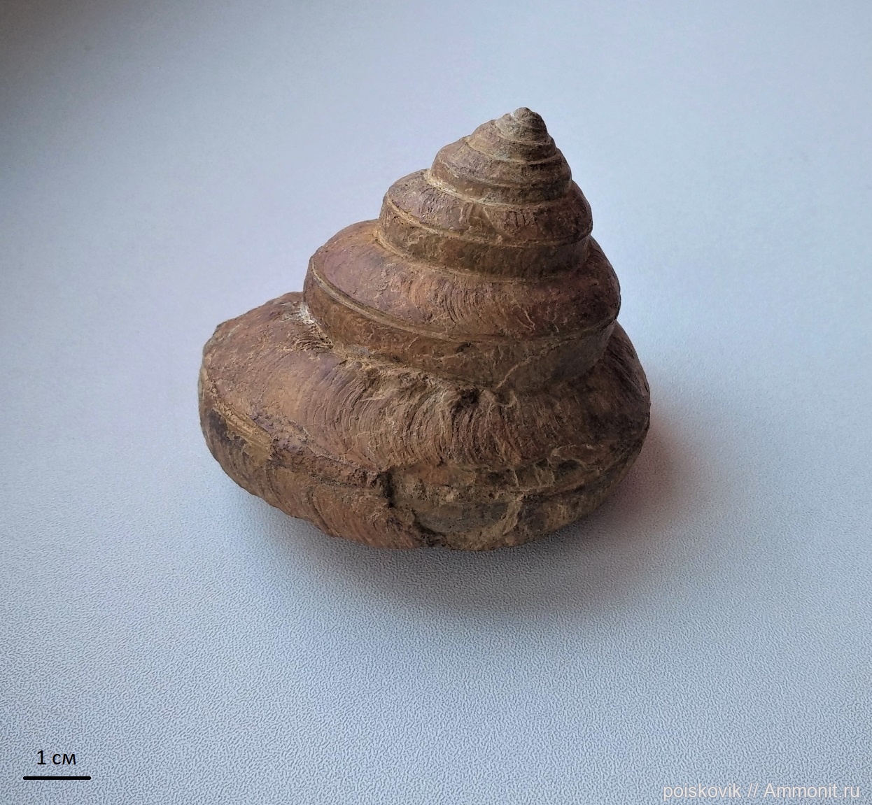 Раковина брюхоногого моллюска спирально-конической формы (ширина - 65 мм, высота - 60 мм) найдена в готеривских породах ( см.Фото) в окрестностях с. Верхоречье. Дополнительный ракурс со стороны основания см. Фото. Просим помощи в определении.