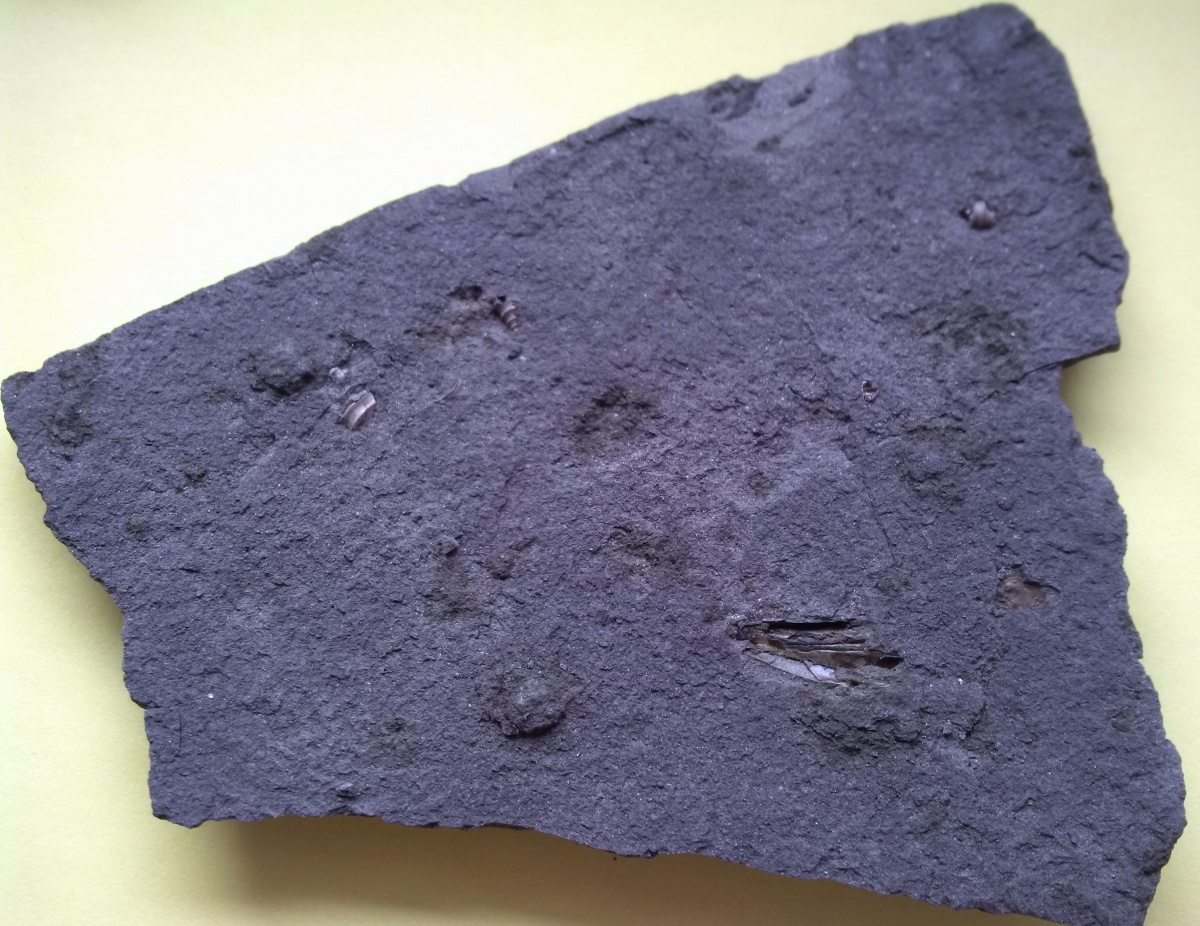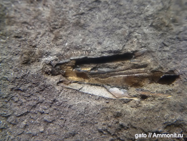 Похоже на Челюсть оксфордской рыбки. Слабо пиритизирована. Есть мнение, что maxilla и premaxilla, так что смотреть надо снизу вверх. Общий вид плитки. Длина рыбного фрагмента чуть более 15 мм. Длина зубов менее 1 мм.