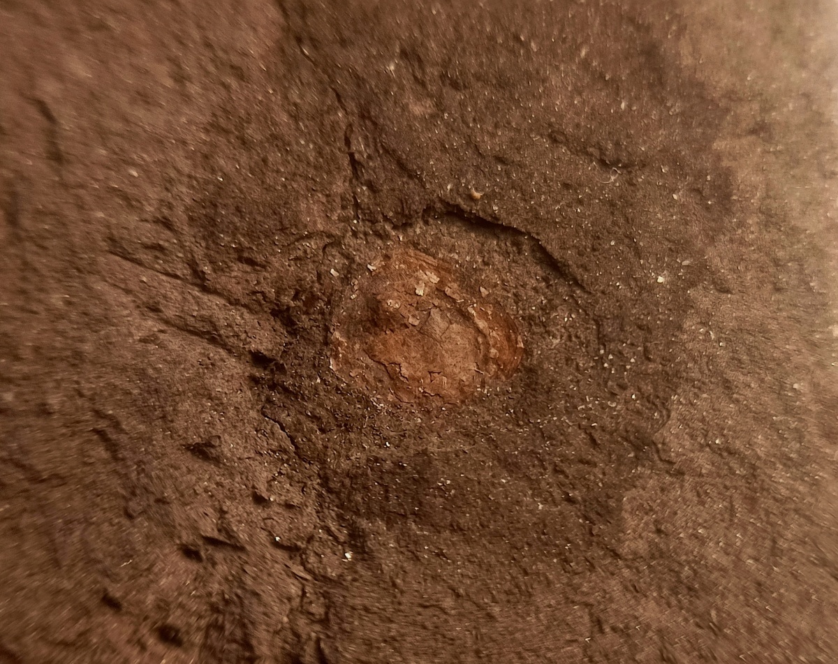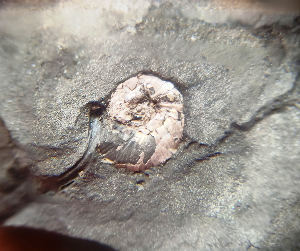 Справа чешуйка длиной 5 мм. На обратной стороне давленый сантиметровый аммонит, гладкий в стиле tenuiserratum, возможно, blakei. Довольно много дикролом