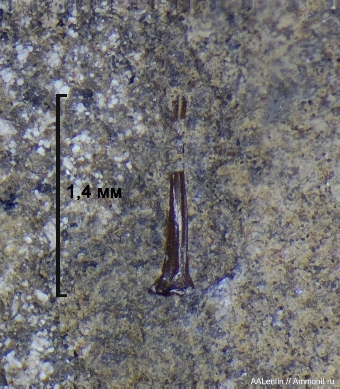 При очередном расслаивании куска горючего сланца от большой плитки ( Отпечаток аммонита Zaraiskites regularis ) открылся вот такой объект. По форме похожий на шип рыбы из плавниковой части. Объект длиной 1,4 мм. Находка видимо имела трещины и при расслаивании, к сожалению, отлетела небольшая её небольшая часть, но кончик остался.