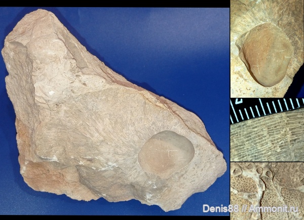 Колония губки Chaetetes, сформированная вокруг раковины гастроподы из семейства Bellerophontidae (размер образца 25 см по большей стороне). Обнаружена в карбонатных отложениях серпуховского яруса на реке Рядань (вблизи г. Пикалёво). Видно, что обрастание раковины на начальном этапе развития колонии произошло по кругу полностью. По морфологическим признакам данный образец наиболее близок к Chaetetes tenuiradiatus. По крайней мере, среди описаний видов из доступной мне литературы. Поэтому со знаком вопроса остановлюсь на данном определении. В породе, окружаемой образец, в большом количестве встречаются фрагменты других морских беспозвоночных: иглы продуктид, отпечатки и фрагменты раковин гастропод, части мшанок, скелетные элементы криноидей, фораминиферы, отпечатки раковин двустворчатых моллюсков. На поверхности имеется небольшая колония коралла Aulopora sp.