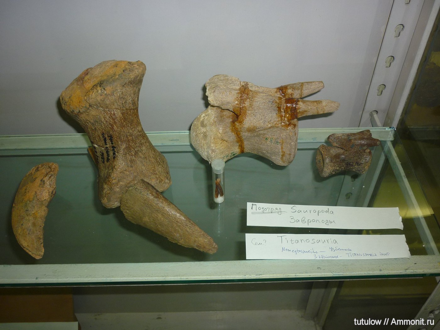 Здесь все по всей видимости от завропод. Слева не рог, а по-видимому кусок когтя. Затем часть ступни (возможно метатарзалия) с когтем, зубки в склянке и парочка хвостовых позвонков. | ||||||