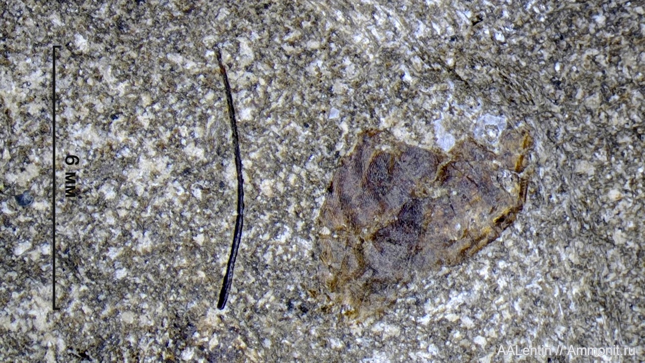 Кстати, на фото также можно заметить фораминиферу. Она у левого края, чуть ниже надписи "6 мм".