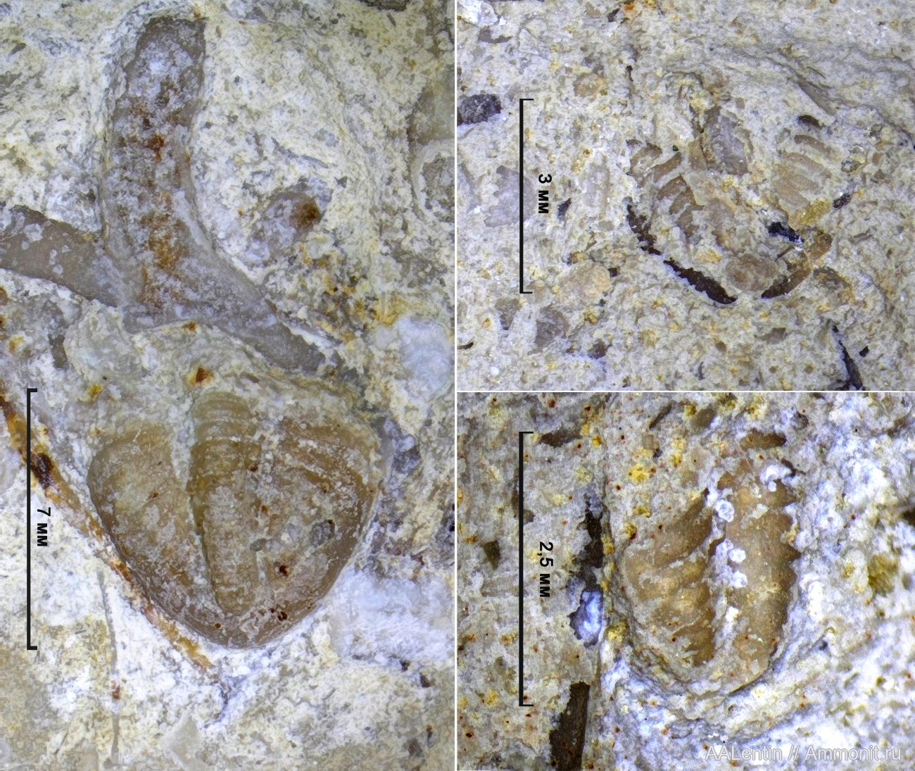 31.03.2023 просматривая кусок плиточки отколовшейся от большой плитки с пигидием двух трилобитов я к своему удивлению обнаружил пигидий третьего трилобита. Его размер 2,5 мм. В связи с этим я изменяю название заголовка публикации.