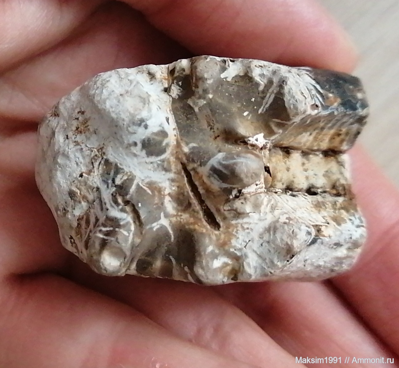 Похоже, что это кусочек аммонита семейства Kosmoceratidae , а ямки в ложбинке - это следы шипов на предпоследнем обороте. Возраст средняя юра, келловей. Если не секрет, откуда это? | ||||||