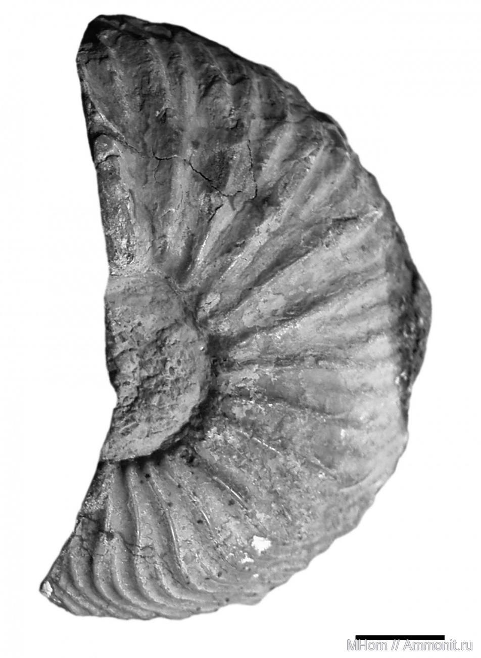 Этого аммонита из оксфорда горы Эгер-Оба (Коктебель) изобразил Д.П. Стремоухов (1923) как C. aff. cordatum, и до сих пор это остаётся единственной изображённой в публикации находкой представителя семейства кардиоцератид из верхней юры Крыма. Хранится в ЦНИГРМузее (Санкт-Петербург), № 22/965. Длина линейки = 1 см.