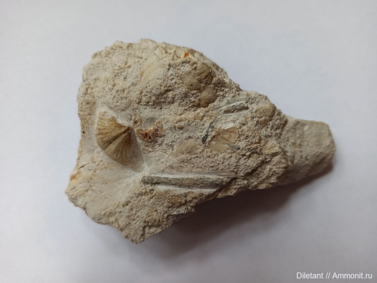 Брахиопода найдена 07.05.2023г в Пирочинском карьере. Размер брюшной раковины 3*1,5см. На породе также имеется частично сохранившаяся иголка морского ежа.