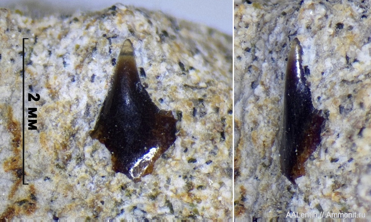 Спасибо. В двух других кусках песчаника при их измельчении вручную (разламывание на более мелкие части) были найдены два разных зубика рыб (коронки) треугольной формы размером где-то 1 мм. Фото обработаю и выложу. | ||||||