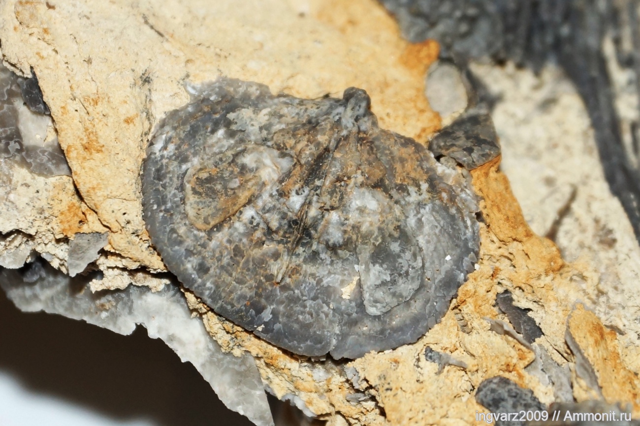 Вытравливал сохранившиеся шипы у крупной продуктиды и открылась симпатичная створка мелкой брахиоподы.