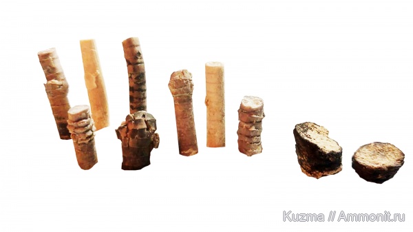 На фото фрагменты морских лилиий, подскажите пожалуйста, нет ли чашечки? А также не могу определить что за окаменелости в правом углу.