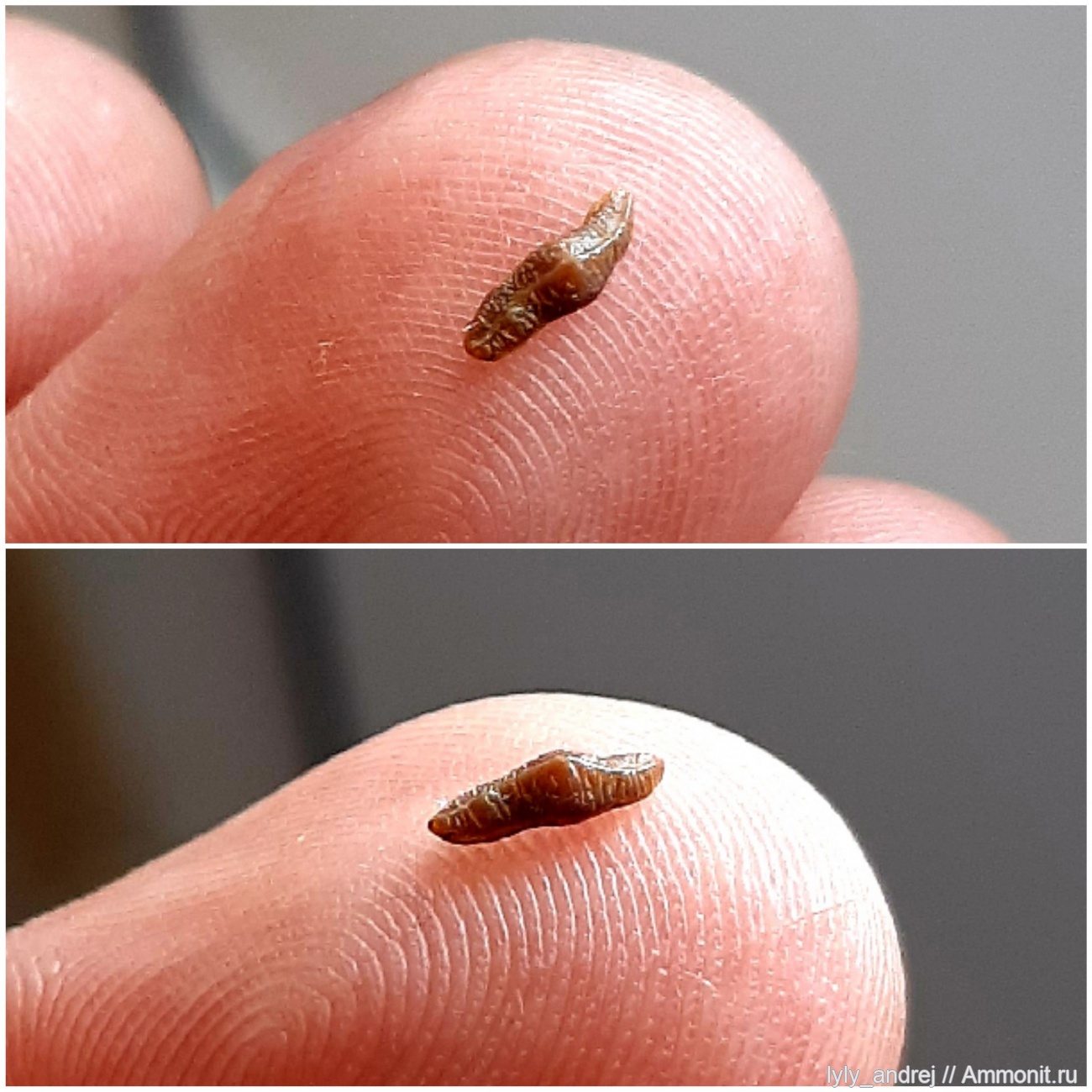 Этот малыш был увиден совершенно случайно, и был принят за живого червячка. Сито лежало на куче отсева (песка), я выискивал зубы, но увидел какое-то движение в одной из ячеек сита. Движение песка под ситом привело в движение этого зубика (ну точно как червячка).