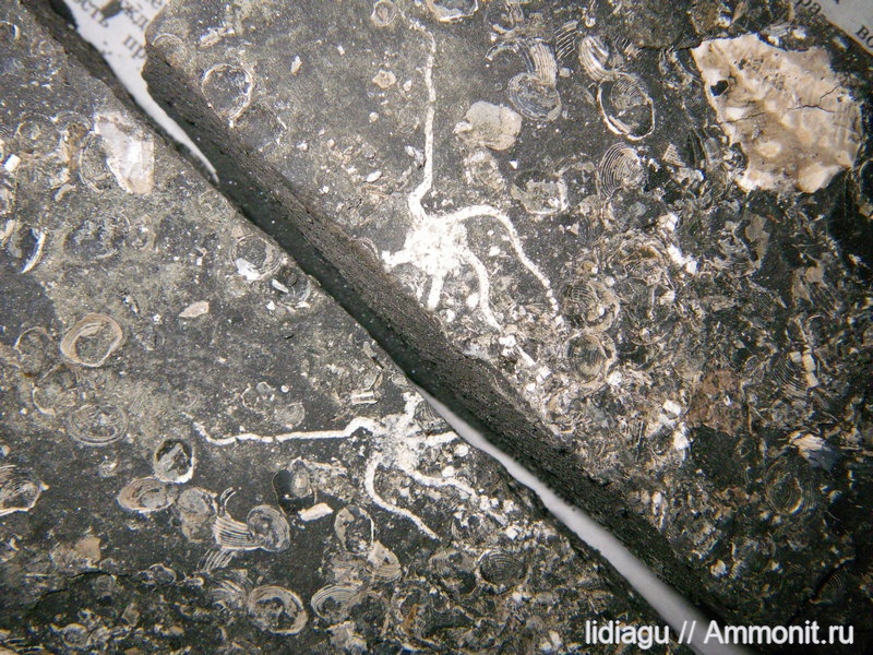 Мелочь на этой плитке - мелкие двустворки. В верхнем правом углу фрагмент створки тригонии. | ||||||