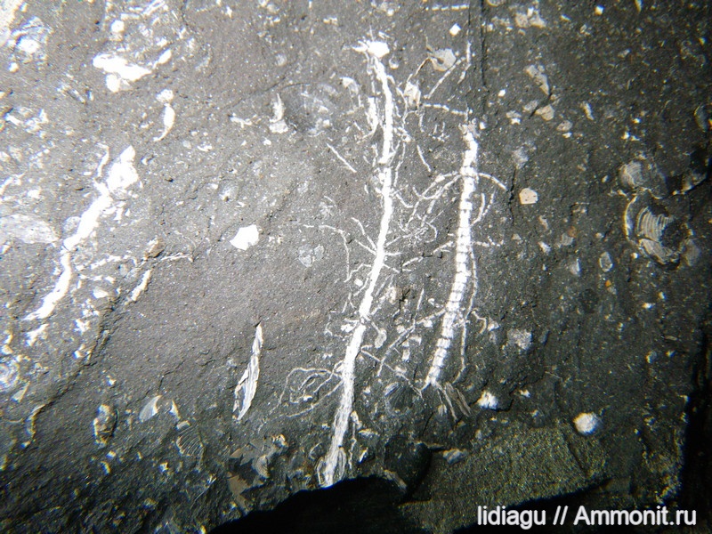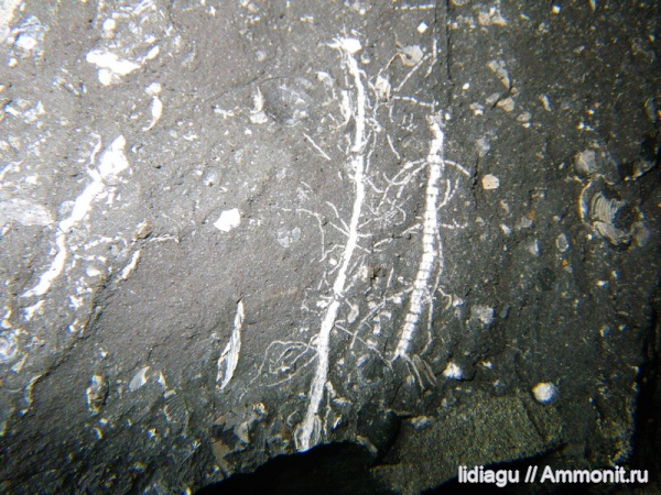 веточки криноидей в сланце. Шахта Новокашпирская.