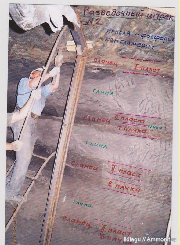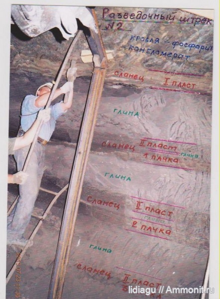 Чередование пород по стенке разведочного штрека №2 шахты Новокашпирская. Высота штрека 2,7м. Ископаемая фауна встречается во всех глиняных и сланцевых слоях.