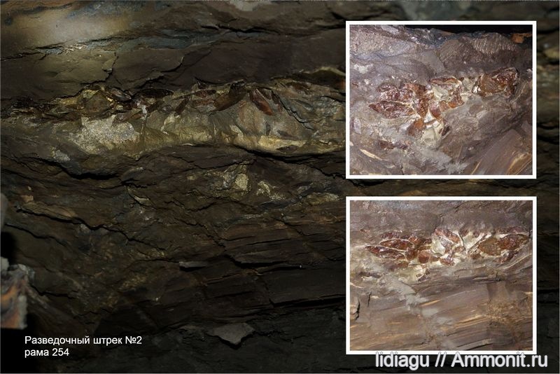 Что-то неизвестное в кровле над I пластом сланца. Лента пиритового прослоя напичкана какими-то "финиками". Возможно и правда что-то растительное попалось. За почти 40 лет подземной работы такое встретилось впервые. Отбить кусочек, чтобы рассмотреть на поверхности, не получилось. Фотографировала со стремянки.