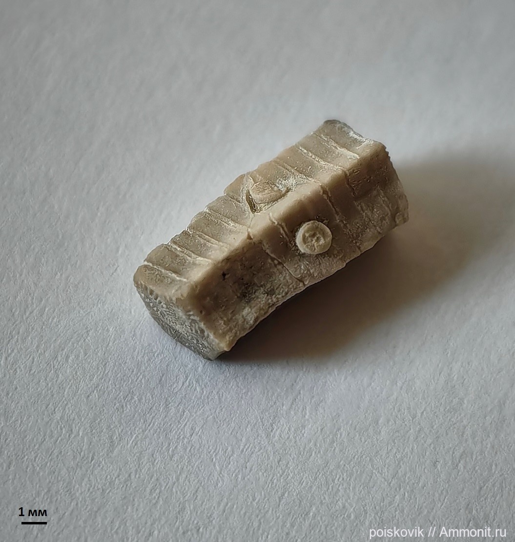 Фрагмент стебля морской лилии Isocrinus? neocomiensis (длина 10 мм) с сохранившимися цирралями.