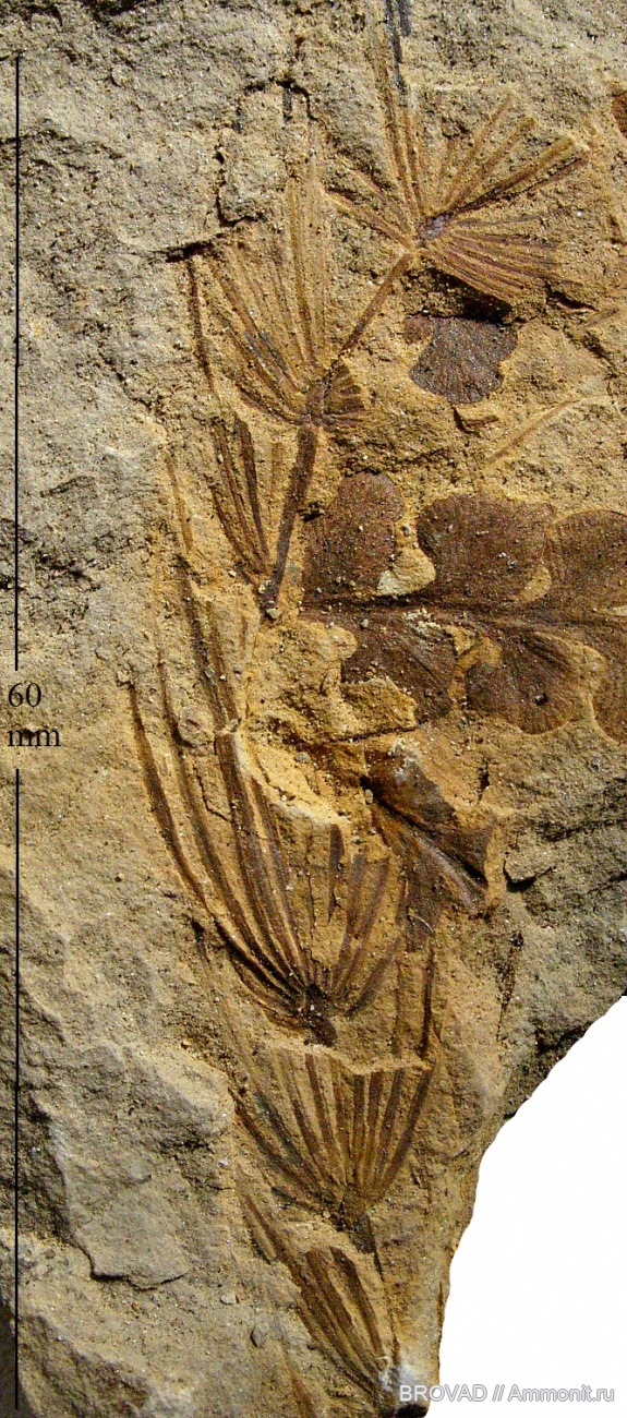 На фото справа, фрагмент голосеменного папоротника Palmatopteris spiniformis (Kidst.)