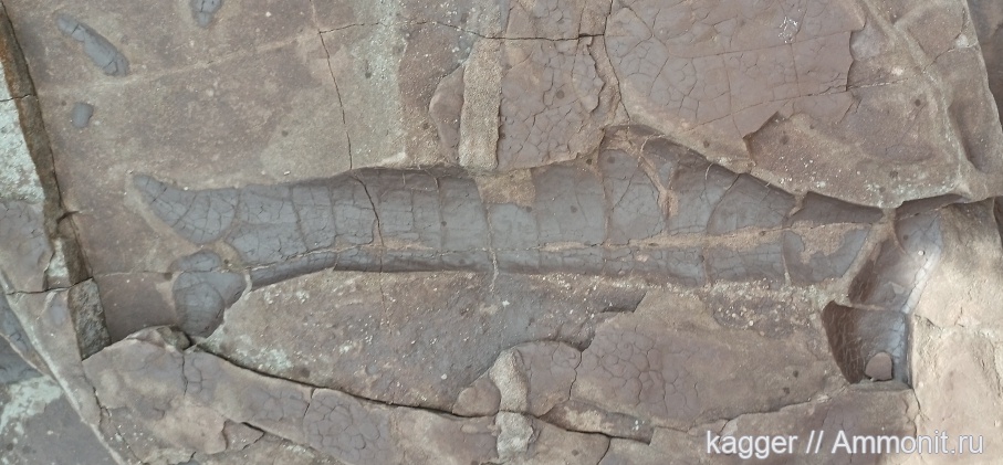Камень плетняк, размер объекта примерно как от кисти до локтя. По поверхности как будто окаменелые толстые корни чего то. И внутри камня, расслоив его довольно легко вот такие объекты. Крупные. С одной стороны сам объект, с другой камень с отпечатавшимся рельефом того что лежало. Объект имеет кольцевые утолщения по всей длине. Конец раздваивается на два треугольных образования. На другом конце что то похожее на колено или сустав . При сколе внутри с одного бока похожее на трубку. Ближе снимать не видно формы. Вся форма окаменелости заполнена. Отделение трубки видно по смене структуры камня в этом месте, другое фото его выкладывала ранее вблизи кусок | ||||||