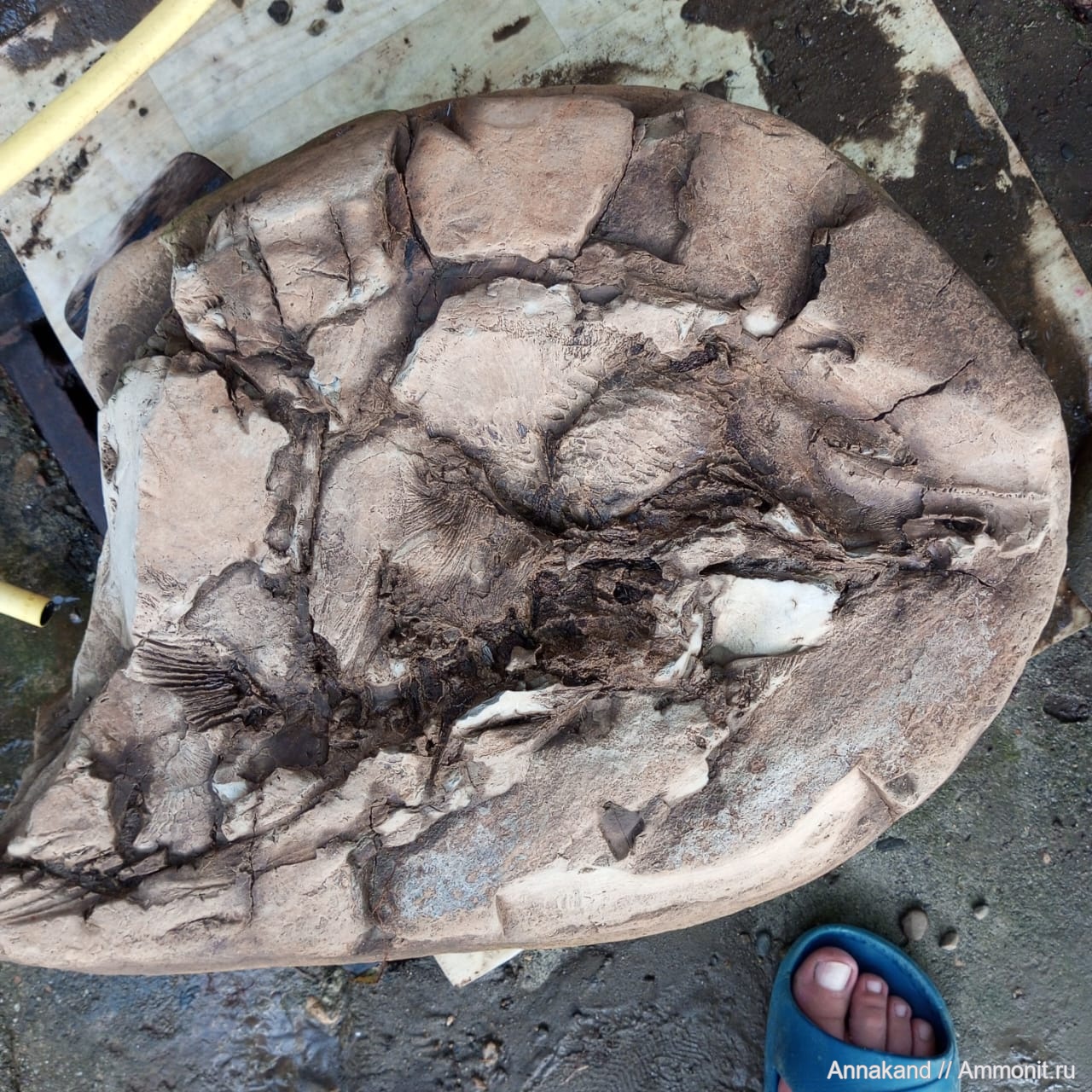 Нашли на речке (Краснодарский край, Апшеронский район) большой камень, сверху он похож на септарию, а снизу окаменелость какой-то доисторической рыбы...Фото не передает так, как в живую, но люди которые разбираются, думаю поймут. Хорошо видно след от головы и зубов, позвоночник, плавники. Присутствуют отпечатки чешуи и и маленькие фрагменты плавников. В длину камень 70 см.