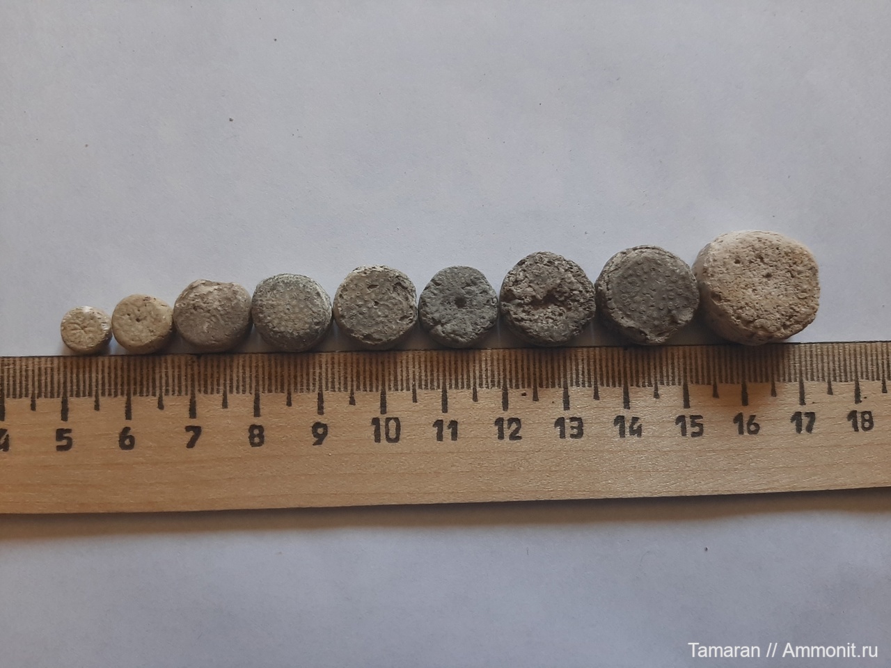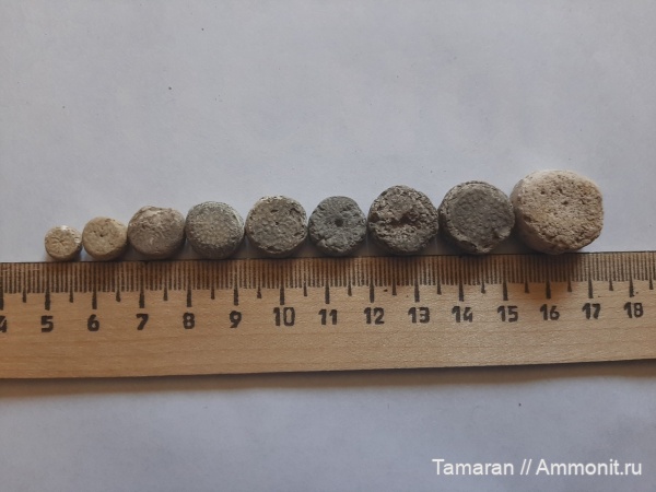Членники морских лилий из Тимонино и Песков, переданные Валентином Горбенко. Все образцы принадлежат к роду циклокринус (Cyclocrinus D’Orbigny, 1850).
