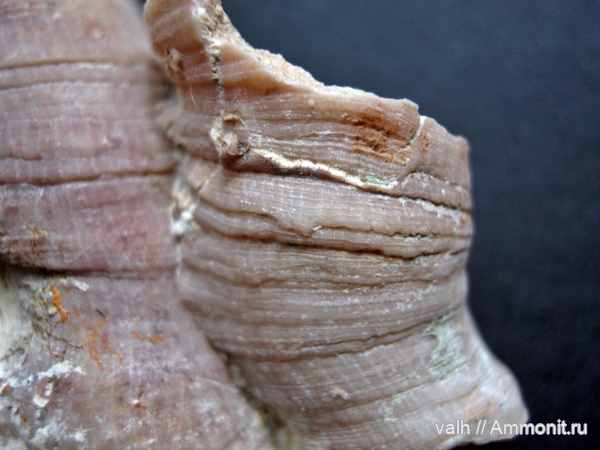 В продолжение темы ругоз, фрагмент колонии Disphyllum из верхнедевонских отложений Воронежской области.На фото хорошо видно лентовидные кольца эпитеки, которые можно рассматривать как своего рода годовые кольца, возникающие в результате смены сезонов. Лентовидные кольца в свою очередь состоят из множества струек которые характеризуют реакцию полипов на смену солнечного освещения лунным. Их должно быть 400 штук, это 400 дней продолжительность года в девоне. Здесь видно только характерные выделяющиеся струйки, полностью увидеть можно конечно только под микроскопом в шлифе. Я так предполагаю что год здесь состоит из двух лент узкой и широкой, то есть стадий быстрого и замедленного сезонного роста.Ну и если померить линеечкой то коралл вырастал за год максимум на 3-4мм, а в день доли миллиметра.