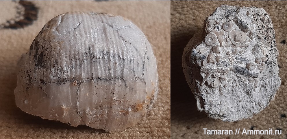 Видимо, все эти образцы собрались под створкой уже после её смерти. Возможно, она накрыла уже лежащие на дне остатки, или их занесло в неё течением. В любом случае, выглядит завораживающе.