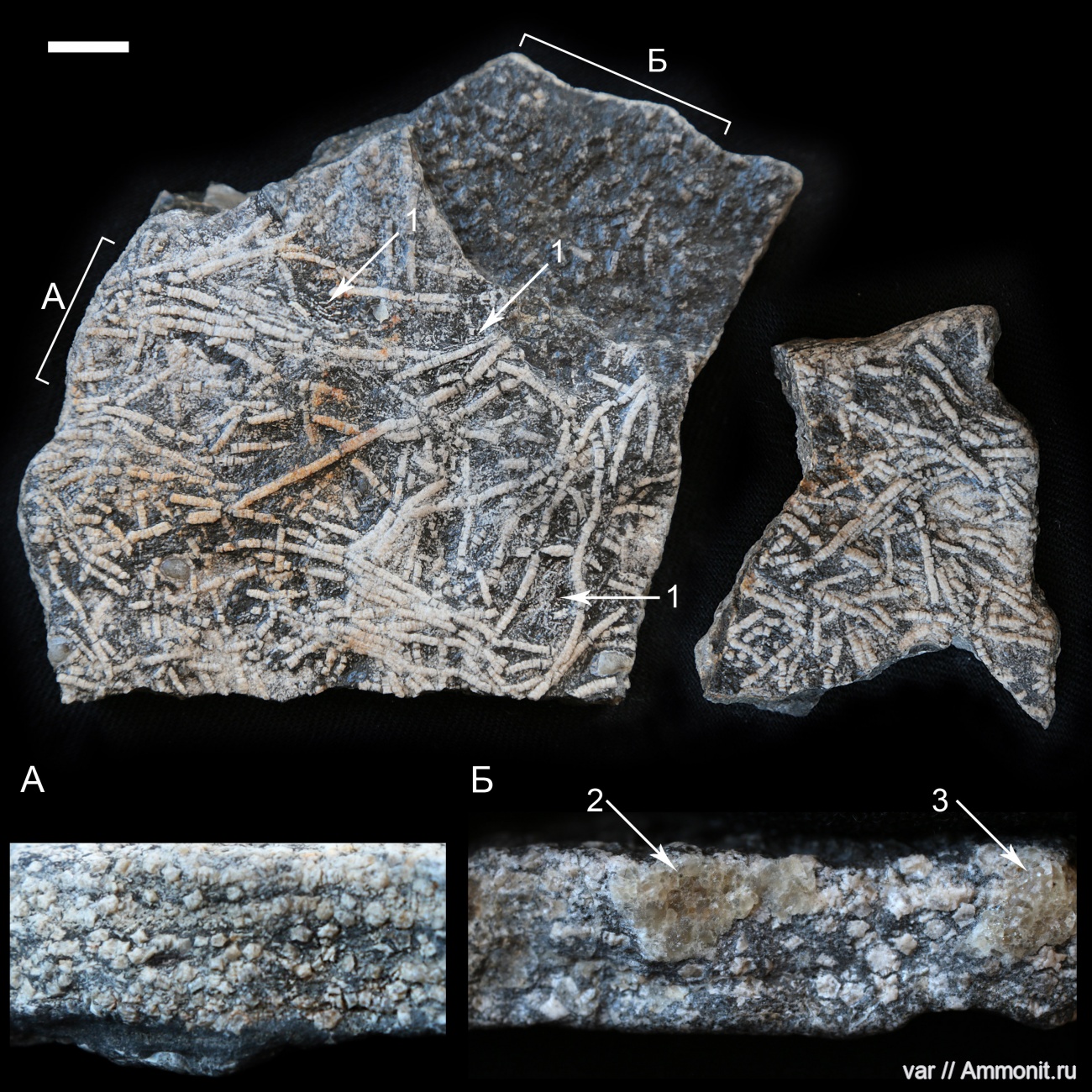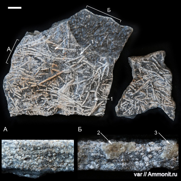 А Вы могли бы снять крупнее? Лучше всего вот эту часть, в ней вроде похоже на ветвления. И мне кажется, лучше с направленным светом, скользящим вдоль поверхности, чтобы были контраст и тени. Хочется рассмотреть эти формы (тонкие стебли? или цирри? или ветвящиеся руки?) получше. Какое у них сечение, классическое круглое, или пятиугольное пентакринидное, или какое-то другое? И если можно, какую-нибудь часть фото А тоже сделайте покрупнее. | ||||||