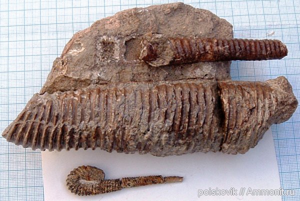 Верхние два фрагмента - безусловно, нисходящая и восходящая части одного достаточно крупного гетероморфого аммонита. Связующий сегмент разрушился в процессе извлечения из твердого эрратического валуна.
